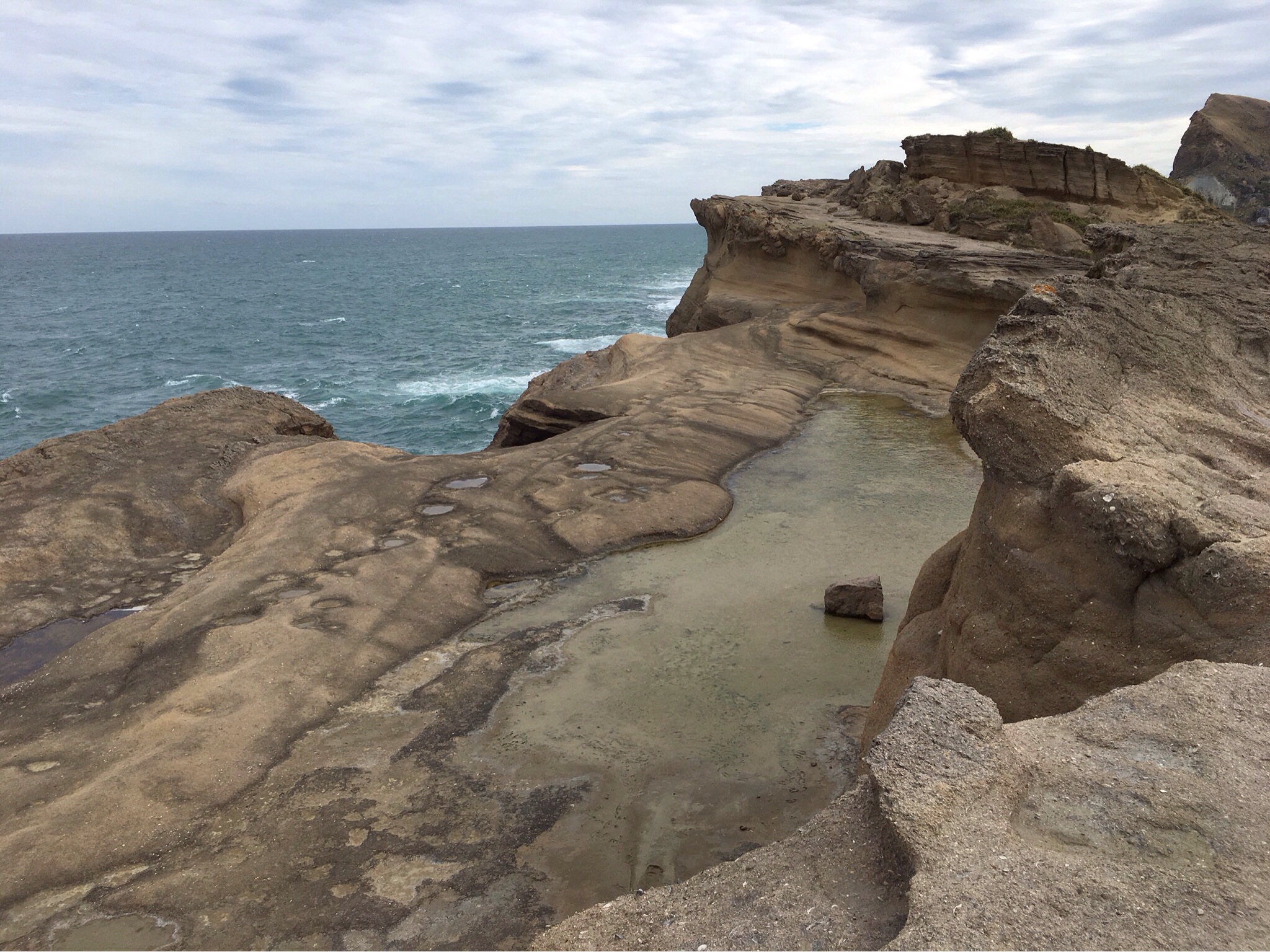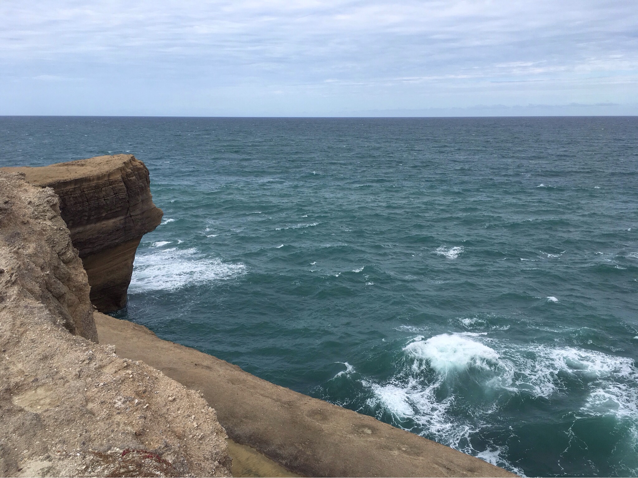 Our return walk took us down yet more steps onto the relatively flat rocks below, the strong winds keeping us away from the sheer drop and menacing sea at its depths as it smashed against the rocks, spray rising up, not quite reaching us with its salty breath.
