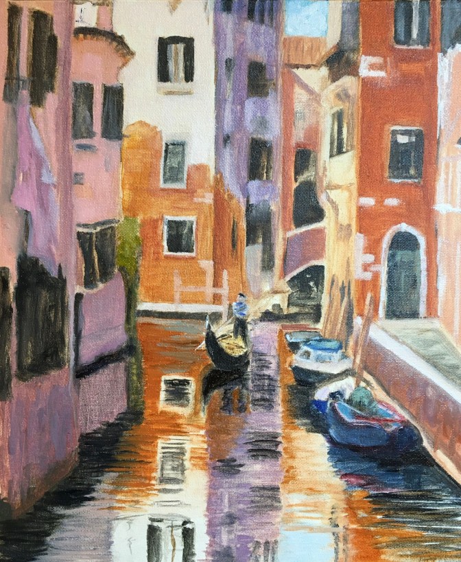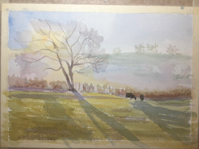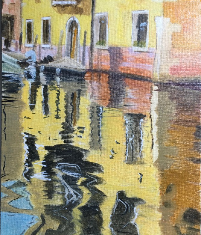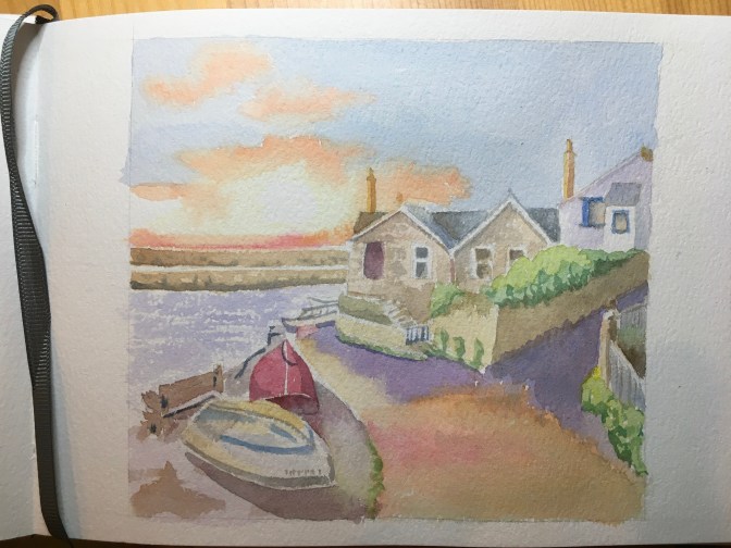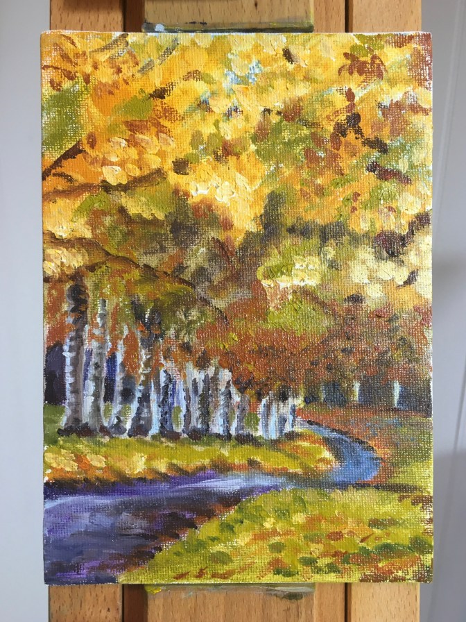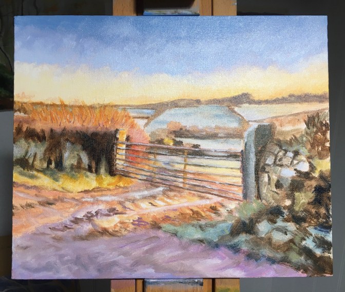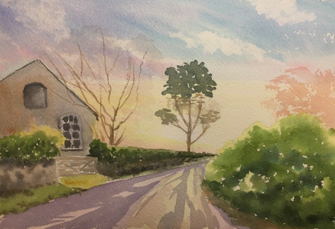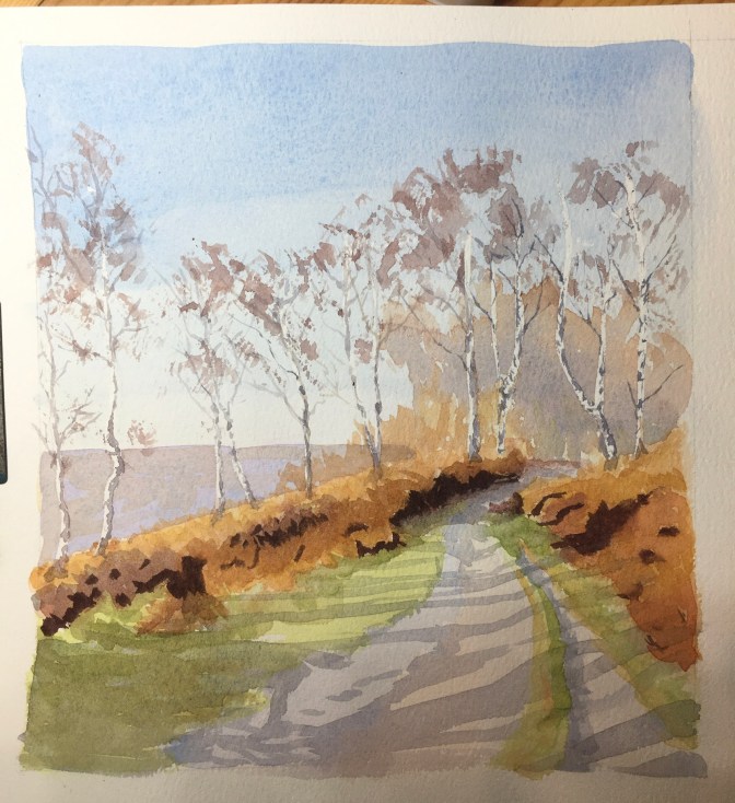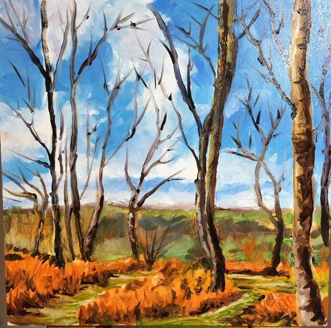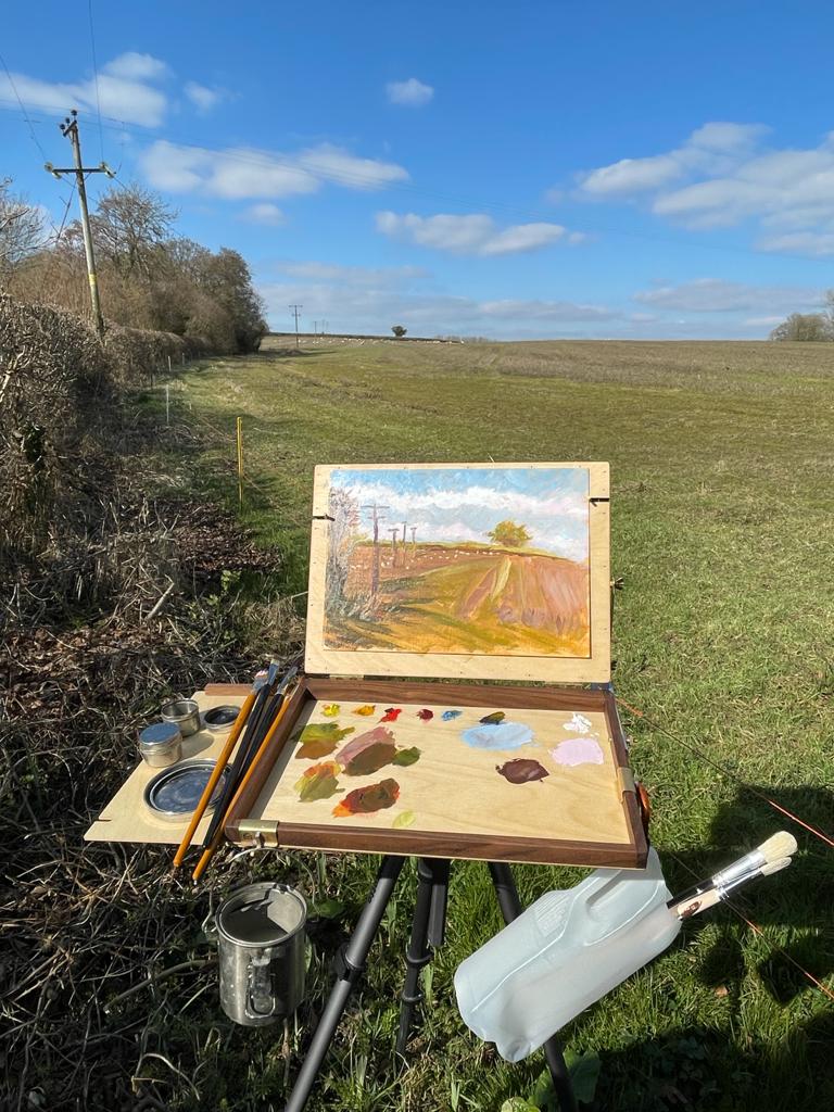 I now realise I am on an uphill struggle to learn the actual ‘alla prima’ style of painting en plein air. But I feel happy to have overcome the first hurdle of getting set up successfully and putting paint to canvas in the open air. The short painting time, limited palette, bigger brushes helped reduce the fiddling with detail but my application of paint needs work in the field!