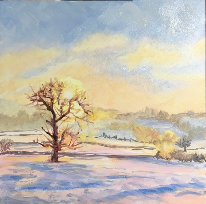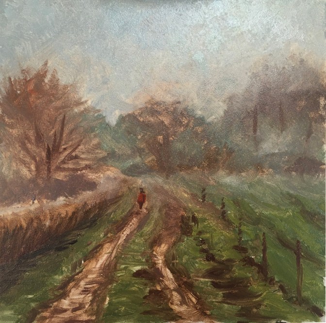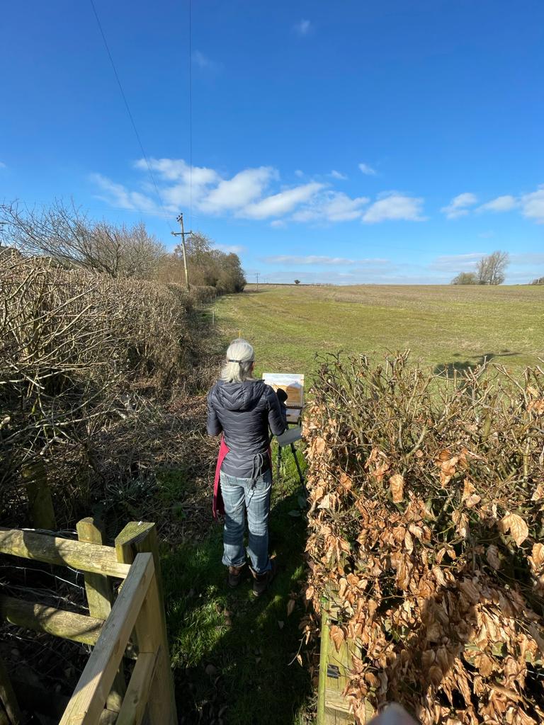 Below is my packed rucksack including ‘The man behind the lens’ old Manfrotto tripod now in the possession of his muse to support a pochade instead of the usual camera. Also this mornings first plein air oil painting set up ‘view from the end of my garden’. It was freezing cold but I was well wrapped up with the exception of my feet, head – I forgot my hat – and the tips of my fingers not encased due to fingerless gloves!