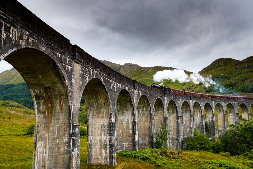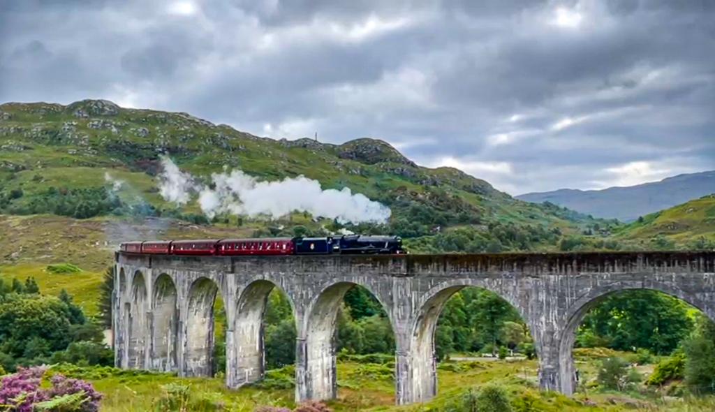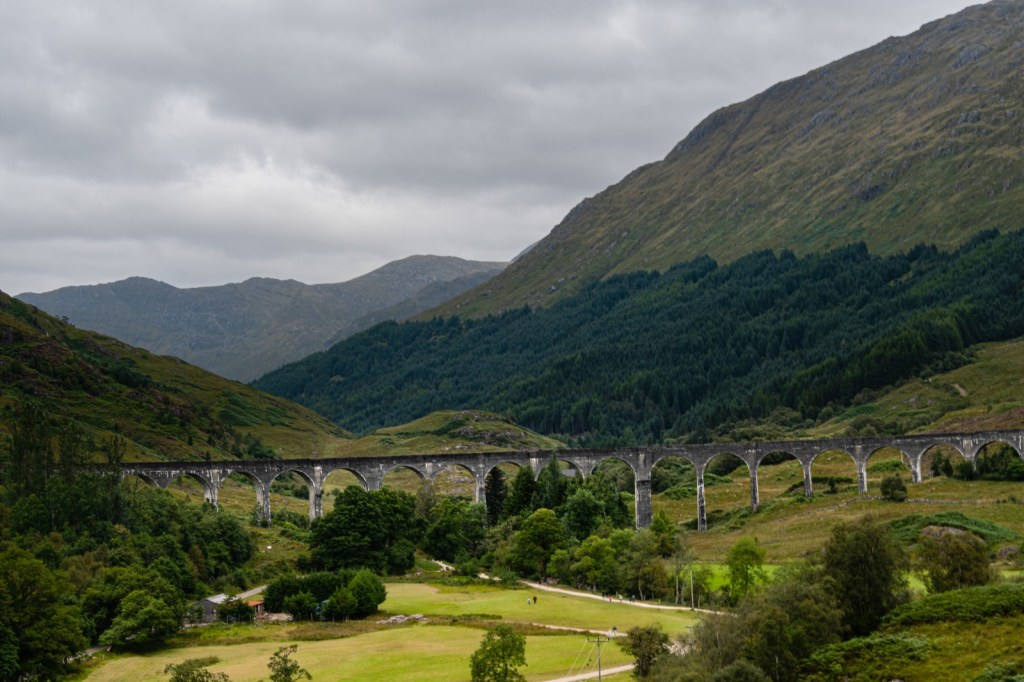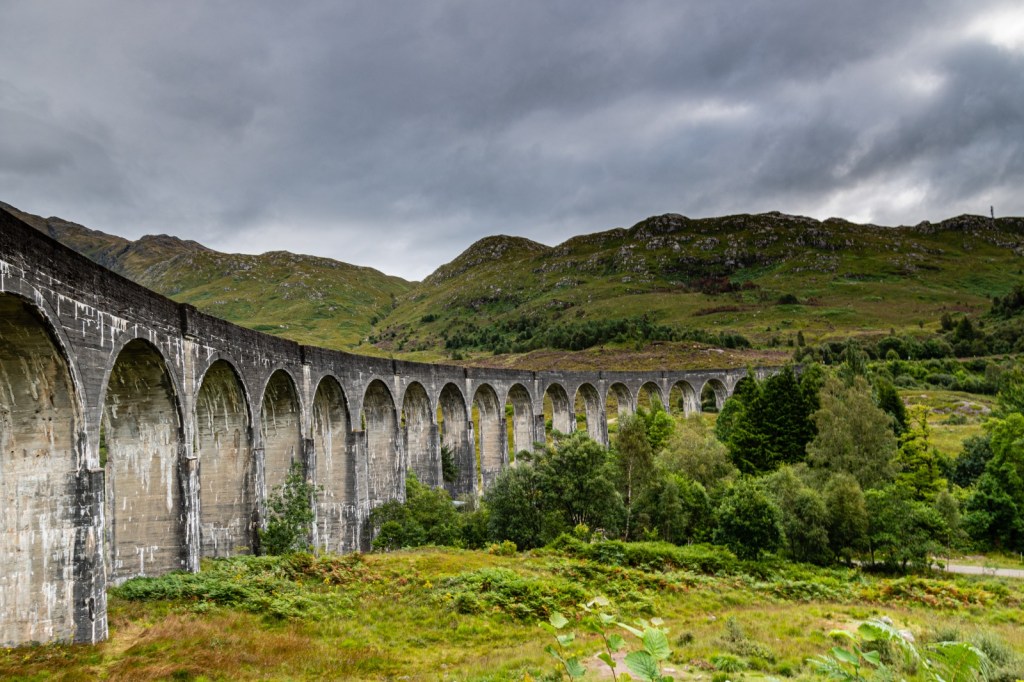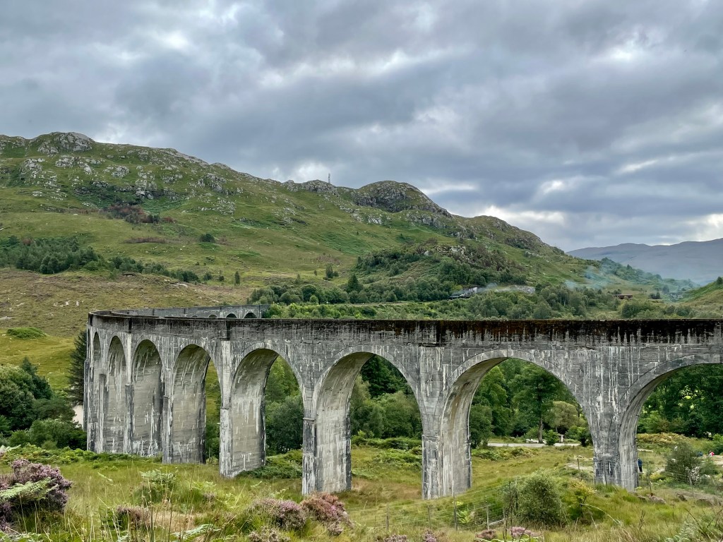 Glenfinnan Viaduct…..An impressive 21-arched viaduct spanning 1,000 ft, 100 ft off the ground, made famous in the second and third Harry Potter films. The viaduct overlooks Loch Shiel and the Jacobite Monument. The ‘Hogwarts Express’ was due to chug over the viaduct at approximately 10.45am.