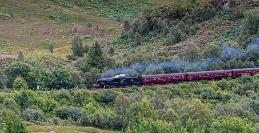 A Toot in the distance, still no visible sign – the train was still minutes away -amazing how sound travels. Then suddenly out from the tunnel came the beautiful Jacobite Steam Train puffing out plumes of smoke as it crossed the magnificent viaduct, a joy to behold.