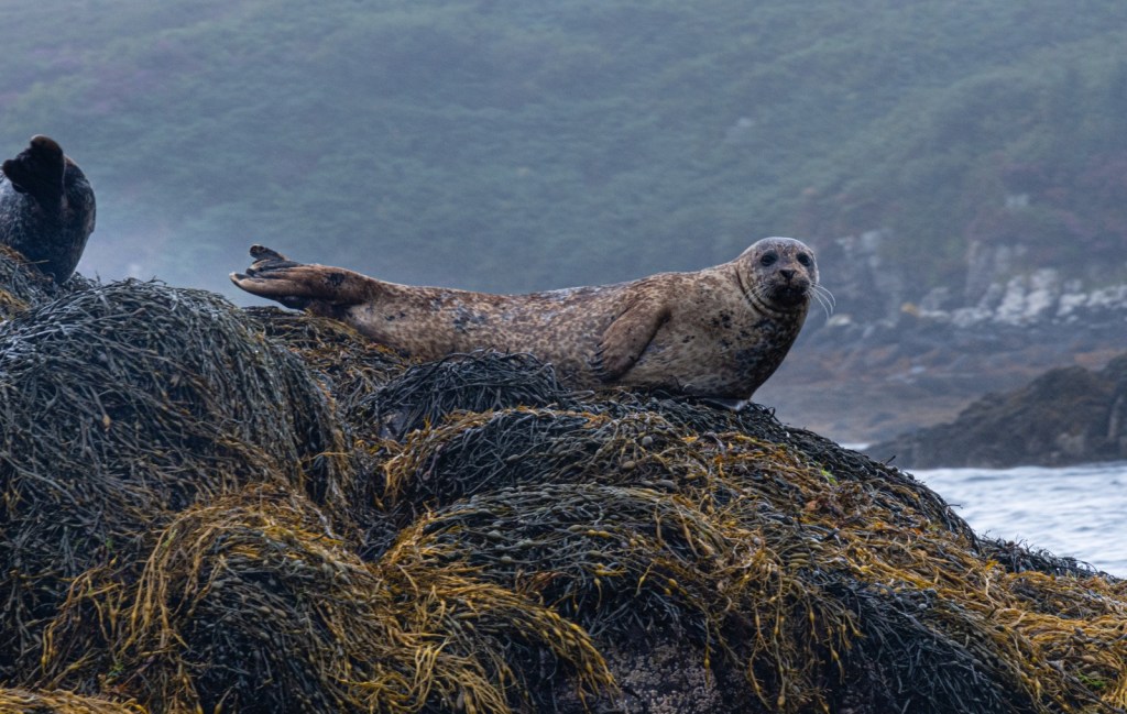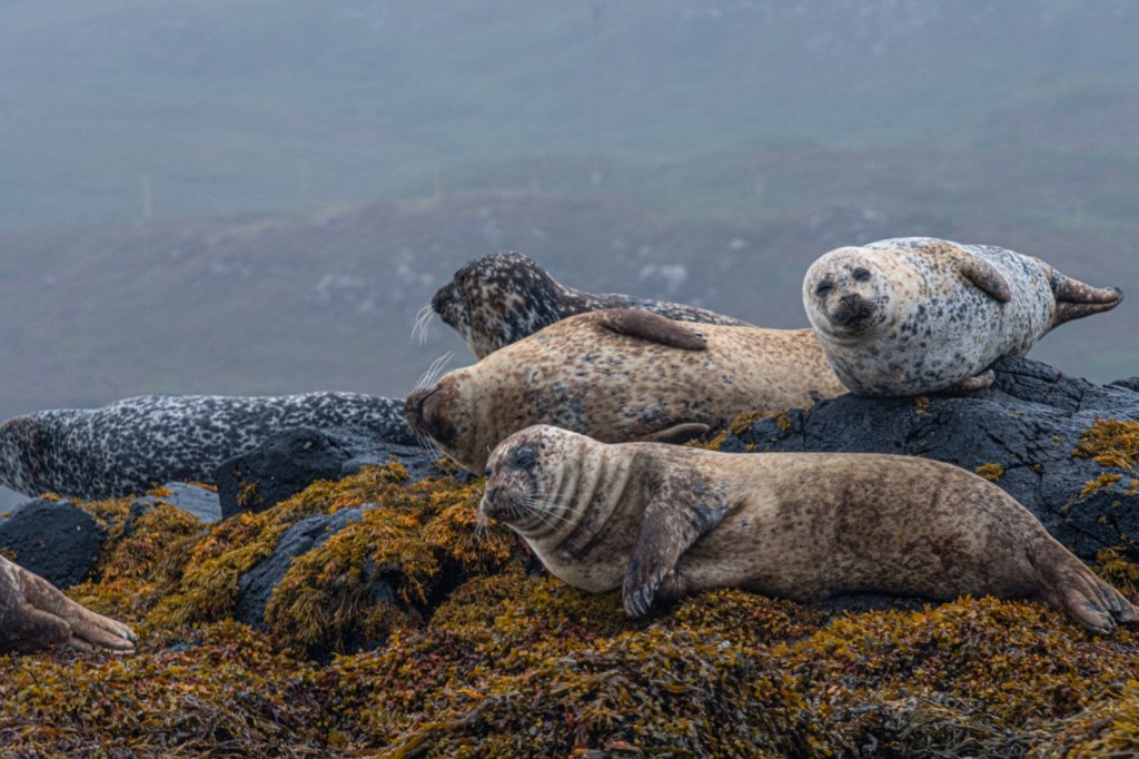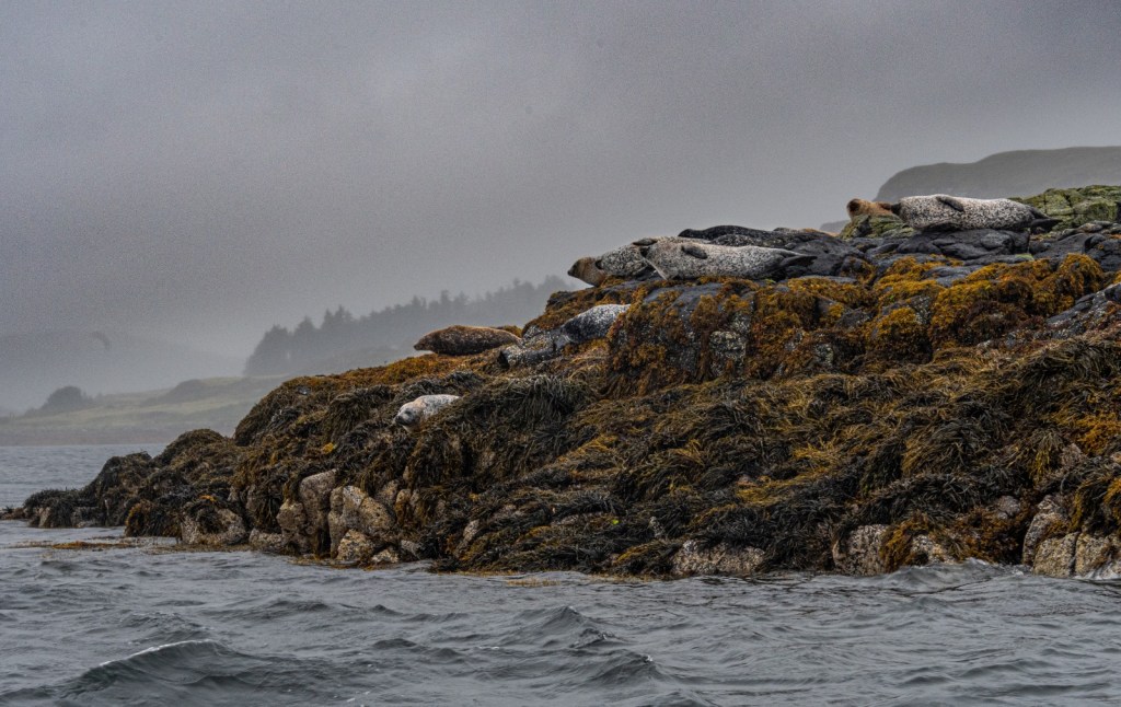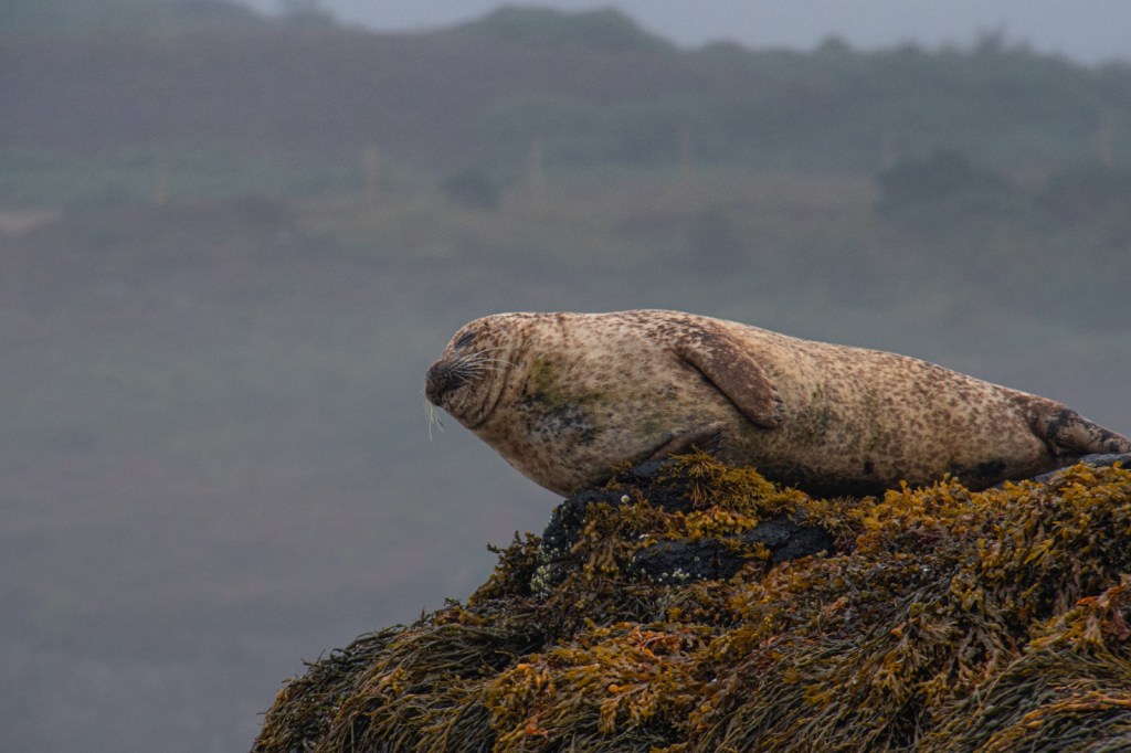 By the time we arrived here the drizzly rain had made visibility poor. Once inside the Castle grounds we decided to start with the recommended Seal spotting trip. The walk down to the shore and our small boat jetty afforded us a beautiful view of the castle and the rich orange seaweed even in dull light conditions only enhanced the bright greens and dark greys.