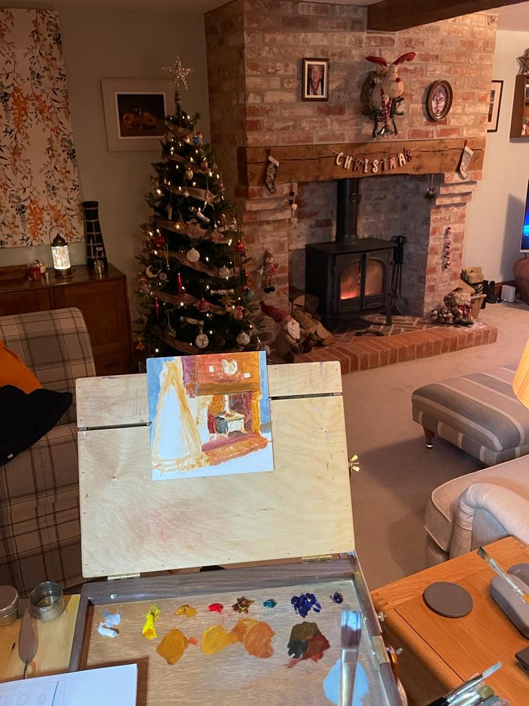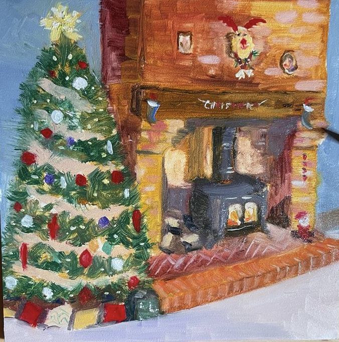 The finished painting ‘Christmas at the Lodge’ Oil on gesso panel 6 x 6 inches
