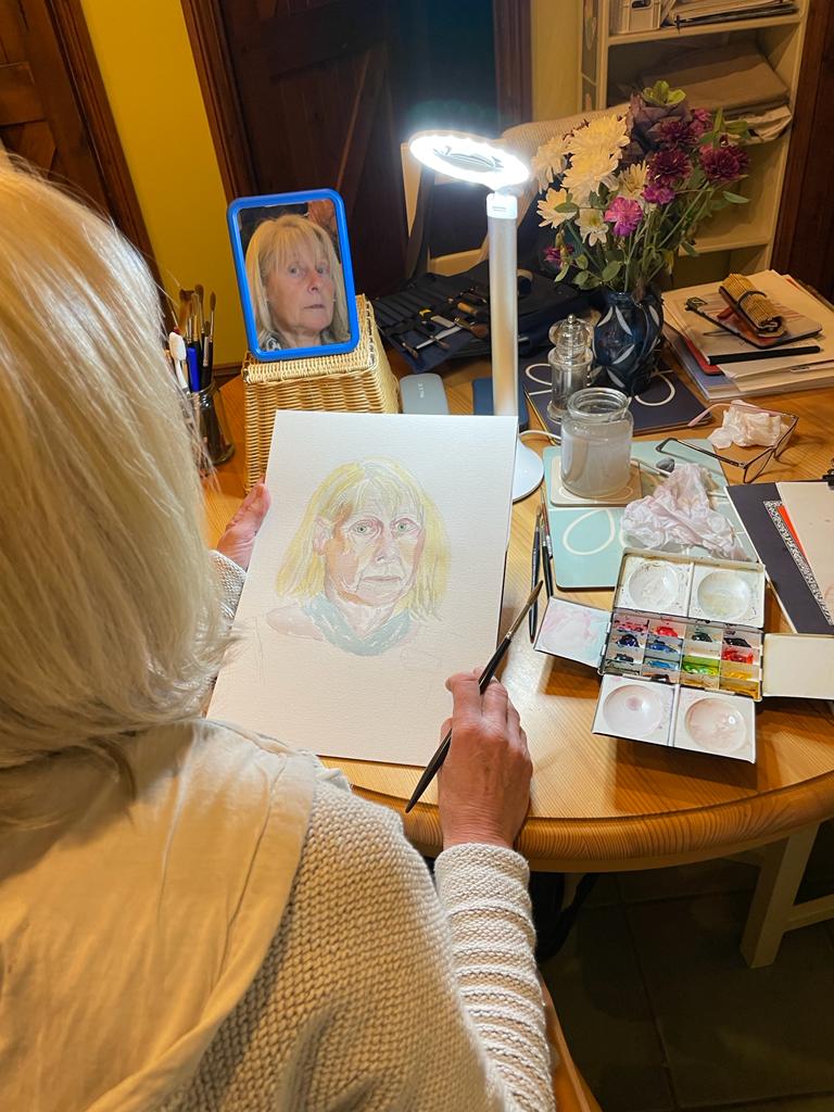 I sketched in the outline and features lightly as a guide and then in with pale washes of watercolour building up the layers from light to dark.