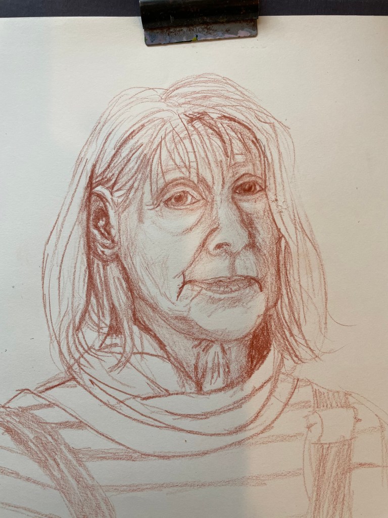 Not to be beaten I tried again with a sanquine oil pencil. I tried a more sketchy approach this time but concentrated more on proportions. I think there is some likeness but not in the eyes they evaded me and one is higher than the other!