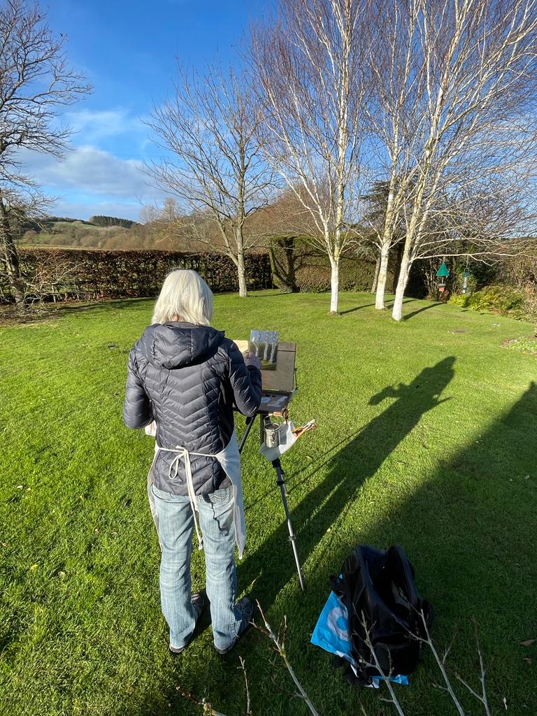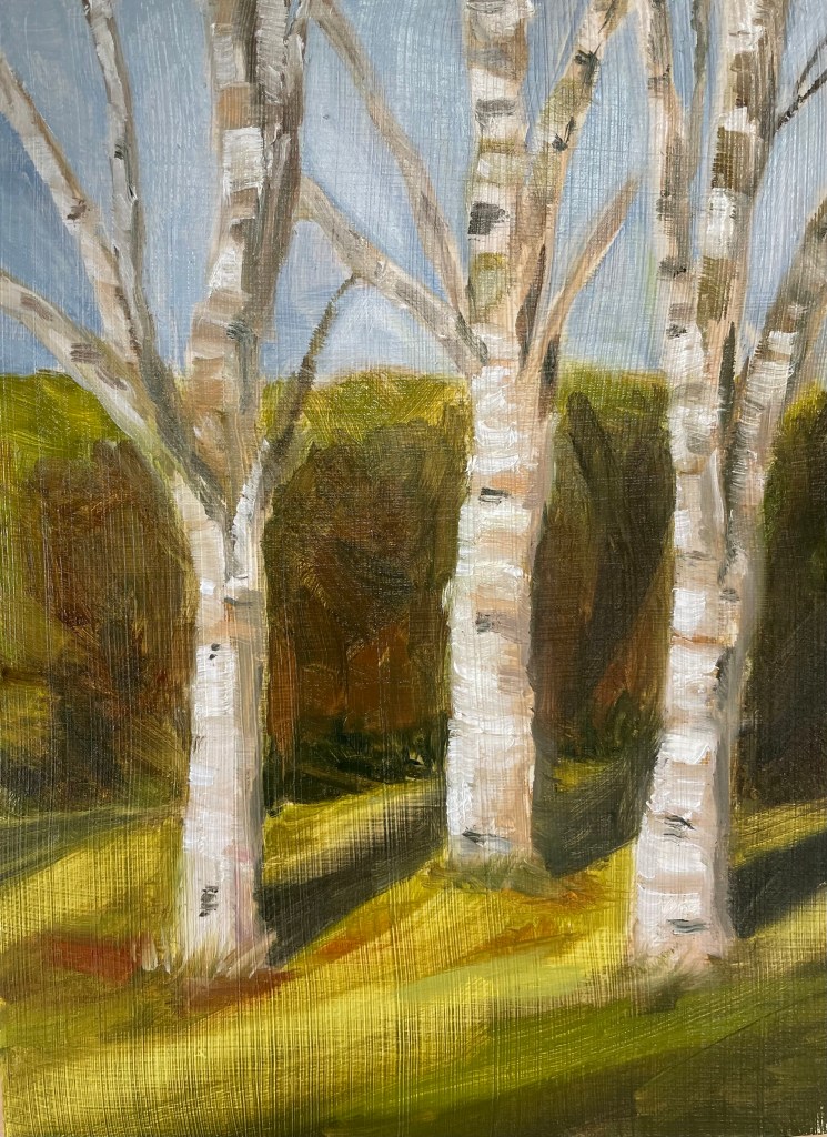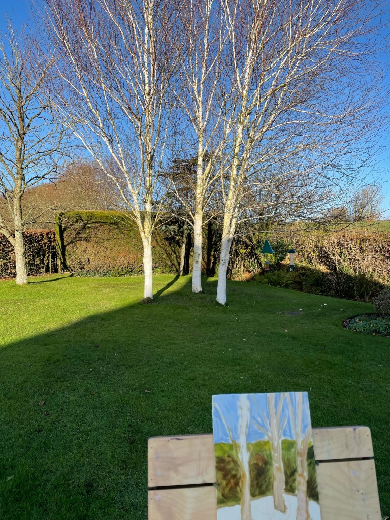 I have often over the years whilst working in this garden admired the little trio of Silver Birch trees, and thought what a good subject for a painting. Especially so when the sun lights up the beautiful bark.