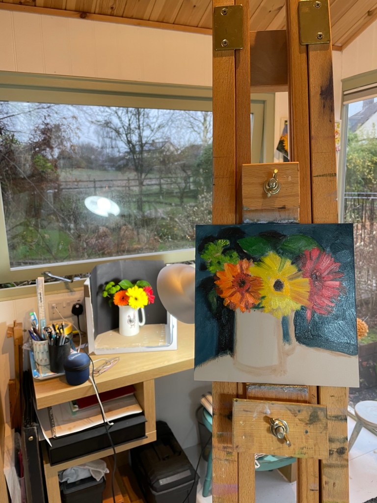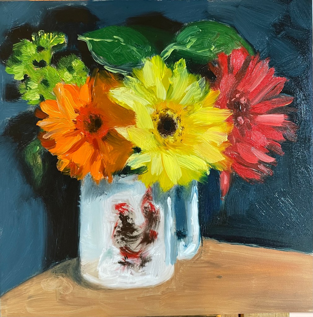 Gerberas & Dahlia in a chicken jug Oil on gesso panel 6 x 6
