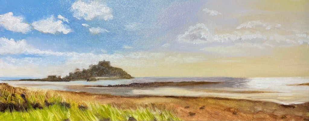 I have a ready supply of ref photos to paint from but to fit the canvas I needed to edit. The image I was excited about St Michael’s Mount with kind permission from Jeremy Sanders Studio, had a lot of sky…not always successful for me. By cropping the sky a lot and foreground a bit the resized image would scale up well for my canvas.