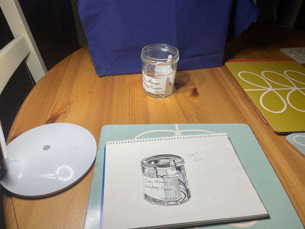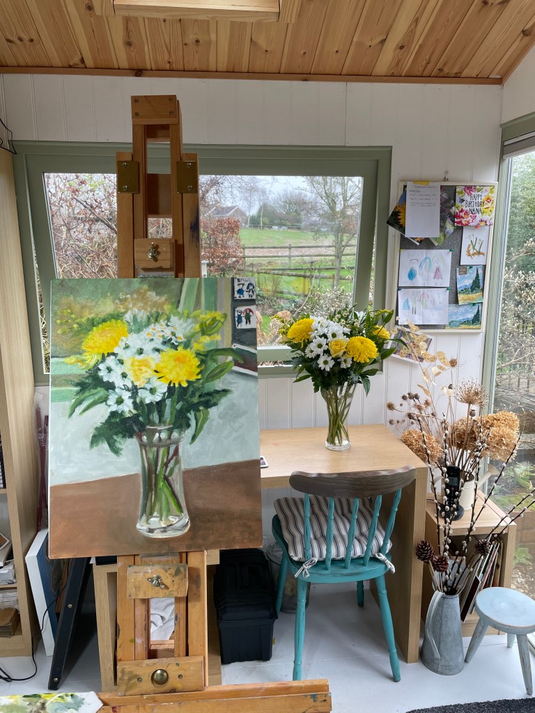 I spent the morning painting the beautiful floral arrangement from my daughter. I decided to really challenge myself by painting the window and part of my pinboard including some art by my grandaughters. I may revisit this one but for now it’s finished.