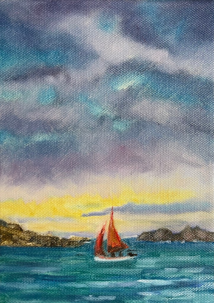 This afternoon I painted from a photo reference from our stay on the Scilly Isles looking out from St Martins. We were lucky the little red sail boat sailed across at the right time.