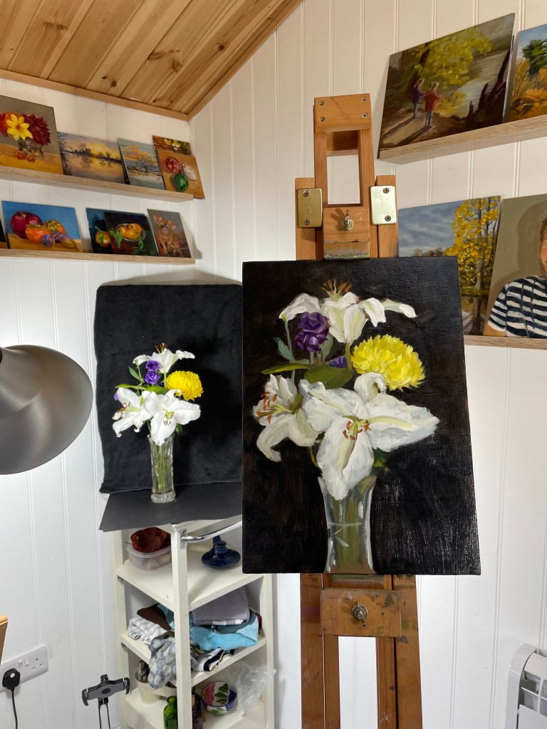 The flowers are the last blooms from the bouquet my daughter bought over two weeks ago. Very good value! I Hope to finish this tomorrow afternoon.