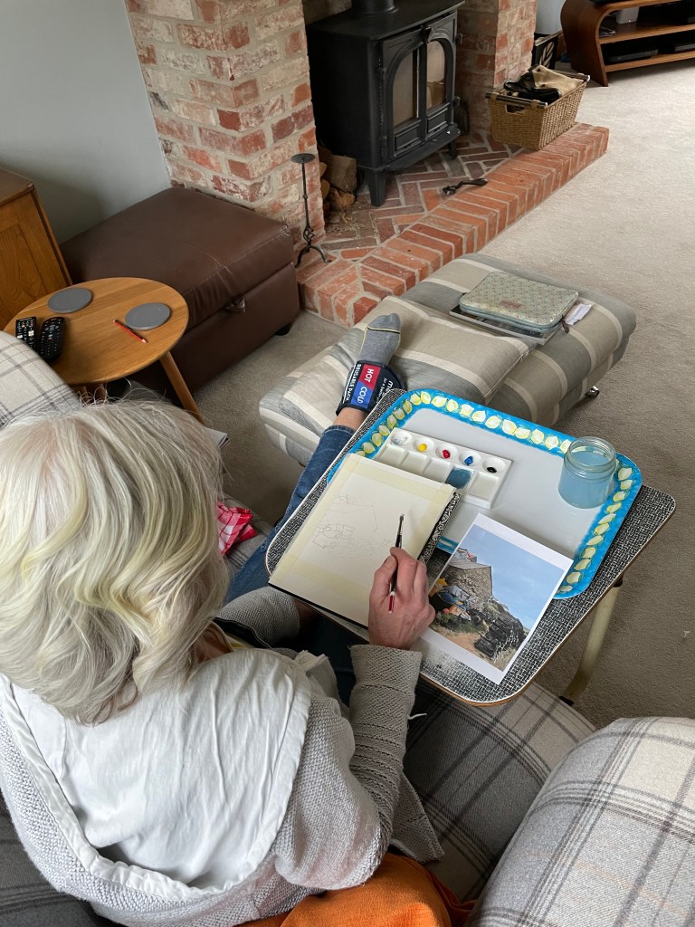 I am back painting but for now gouache….more furnishings friendly than oils and I can keep my leg up!